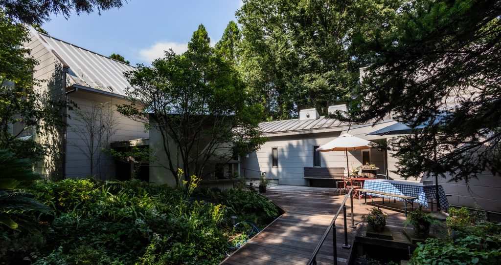 駐車場から木々に囲まれた小路を歩いてたどり着いた「カフェ・ルコック」。白い外壁が印象的な建物は、音楽ホールとしても使われているのだそう。
