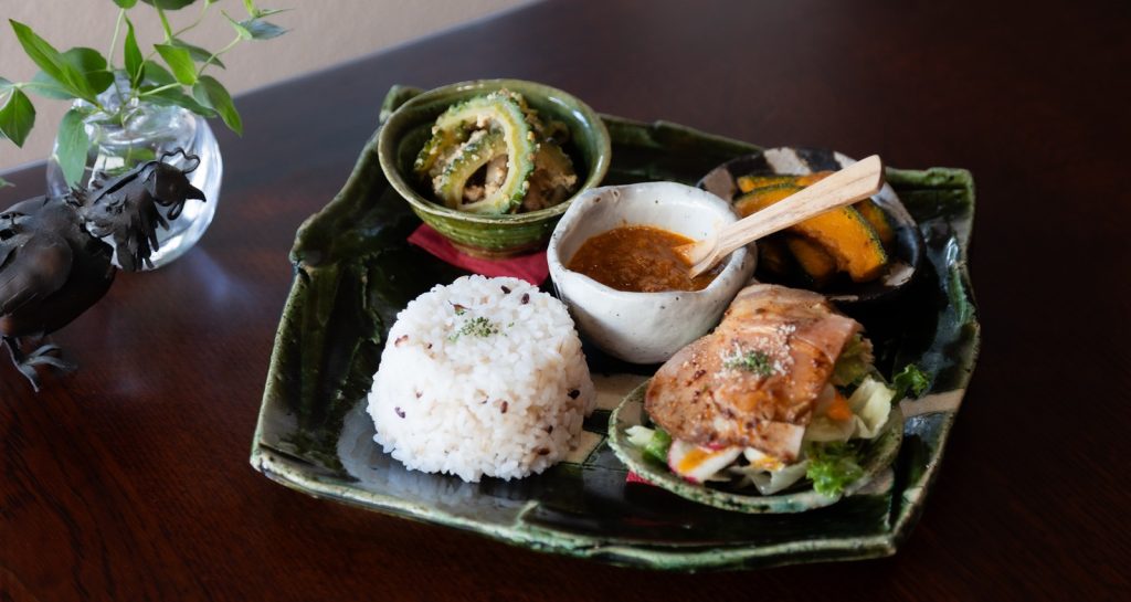 もうひとつの人気メニューは、3種のデリと三穀米を盛り合わせた「デリプレート」(1,210円)。今回は「ちょいタイカレー」(220円)をセットにしました。取材時のデリは、「深谷産栗カボチャのマリネ ローズマリー風味」、「沖縄風ゴーヤチャンプルー」、「三元豚のローストポーク サラダ添え」の3つ。内容は日替わりなので、訪れるたびに違った味わいが楽しめます。