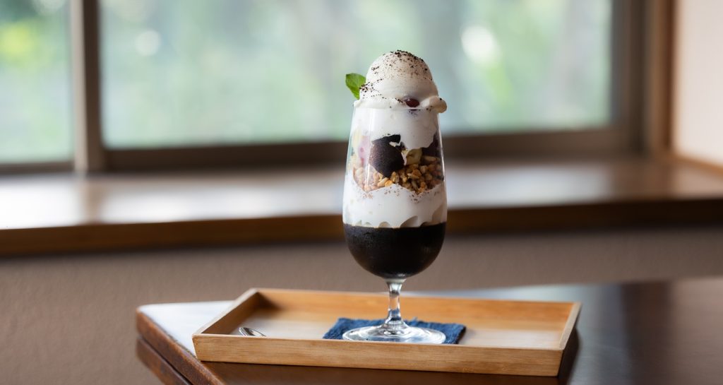 コーヒーゼリーにはあえて甘さを加えていないため、上に乗ったココナッツアイスやクリームの甘さが加わることで、コーヒー本来の豊かな苦みが引き立ちます。中央部分にはフルーツやグラノーラも入っており、食感や味わいの変化も楽しめる、大人味のパフェに仕上がっています。