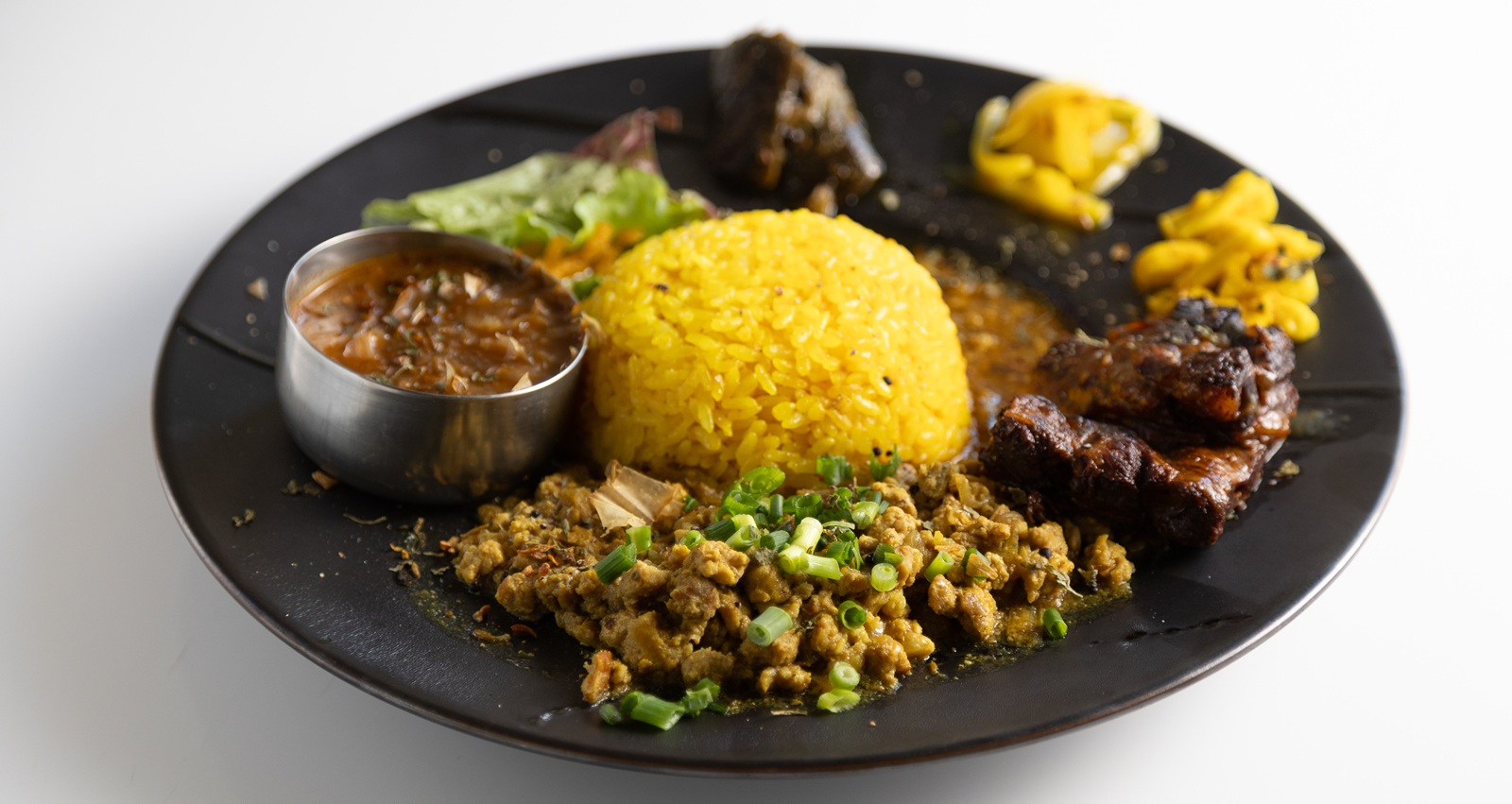 一番人気の「お得カレーセット」(1,580円)は、3~4種類から選べる日替わりの「本日の限定カレー」と豚バラ軟骨カレーをあわせた合いがけのカレーに副菜がつきます。「常にスパイスの新しい可能性を探り、自分が納得できるまで妥協せずに作っています」と話す飯田さんのこだわりが詰まった本日のカレーは、これを目当てに通っているお客様も多いとのこと。