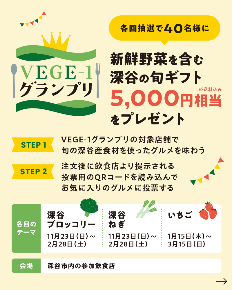 期間中、深谷市内の各飲食店が旬の「深谷ブロッコリー」を使った絶品メニューで皆さまをお出迎え。グランプリをかけてしのぎをけずります。お気に入りのお店に投票して、抽選で豪華賞品をゲットしよう!