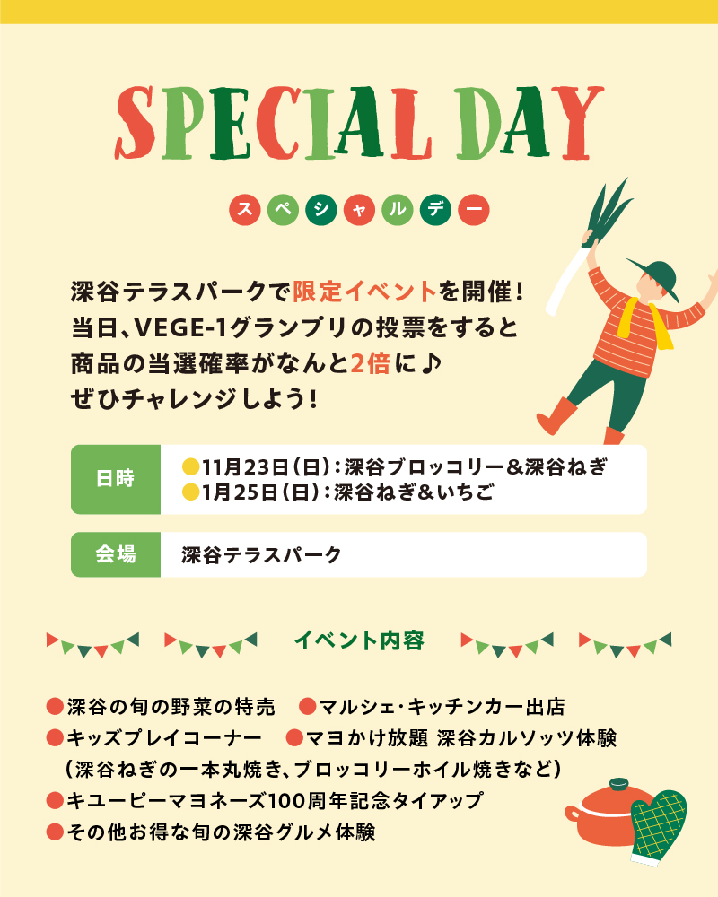 旬が始まる11月23日(日)は毎年恒例の「深谷ねぎらいの日」と深谷グルメフェスの開始に合わせて「深谷ブロッコリー」と「深谷ねぎ」がテーマのスペシャルイベントが開催。VEGE-1グランプリエントリーメニュー(一部)の他に、この日しか味わえない1日限りのふかやさいグルメが登場!「深谷ねぎ」や「深谷ブロッコリー」の深谷カルソッツ体験(丸ごと一本焼き)や、旬の深谷ねぎや深谷ブロッコリーのお得な直売会の開催、深谷ねぎ束をつくる無料ワークショップなど盛りだくさん!!大型遊具もあり、親子で一日楽しめちゃいます。近隣で同時開催のトラックファミリーフェアと2会場を訪れると素敵なプレゼントも。