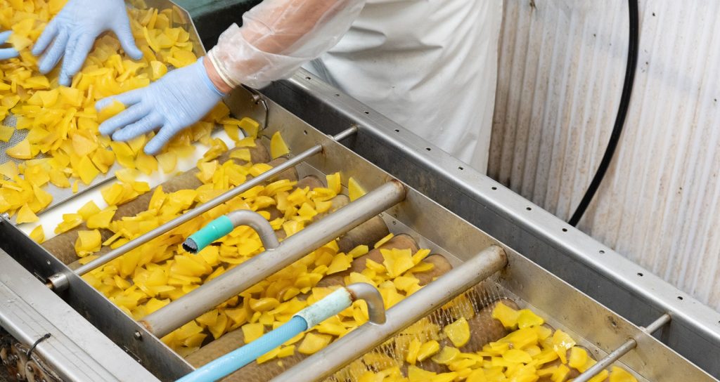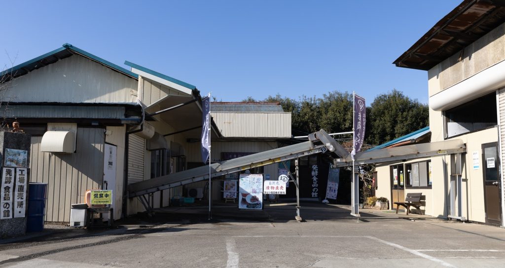 深谷市岡部に本社と工場を構えるマルツ食品株式会社。左右の建物が工場で、写真中央のベルトコンベアの奥にあるのが事務所と直売所です。