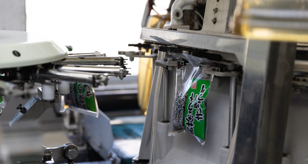 計量のうえひとつひとつパック詰めされた「お茶うけきゅうり」は、ベルトコンベアで運ばれてさまざまな検査を通過したのちに出荷されます。