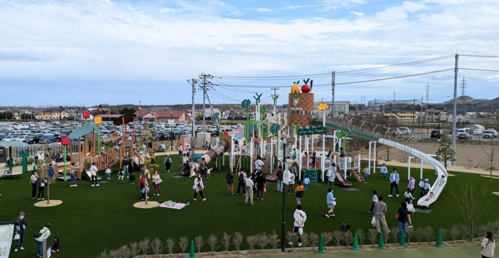 深谷の野菜や特産物、深谷市公式キャラクターふっかちゃんをモチーフにした大型遊具『ベジタブルマーケットランド』は、デザインも可愛く、全身を使って遊べるため、子どもたちが集まる人気のスポットです!2025年には全面人工芝にリニューアルし、親子で一緒に広々と楽しめる場所となっています。