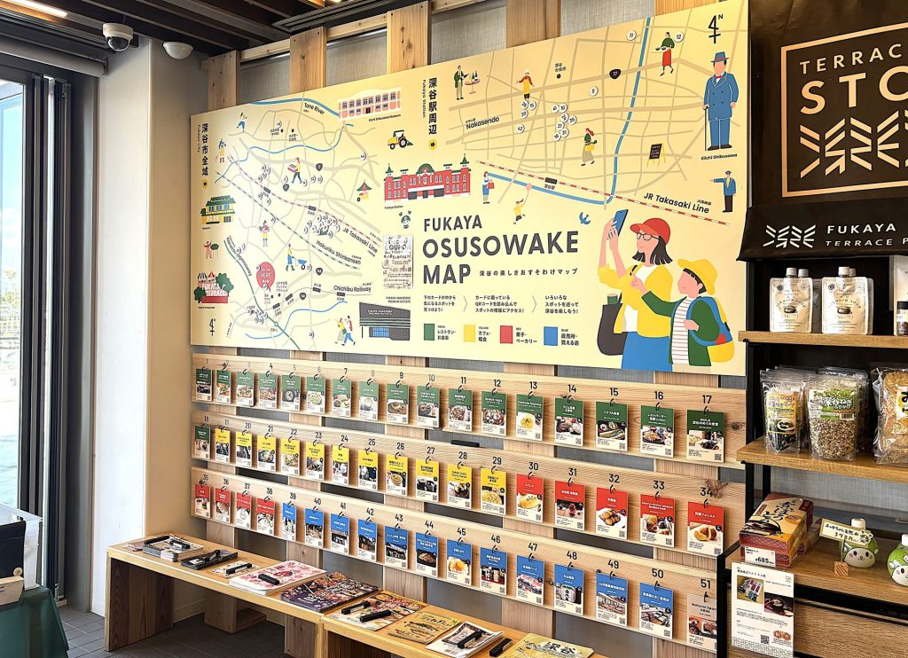 深谷テラスパークを起点に、深谷市のまち全体を楽しんでもらうため、管理棟多目的室内に「深谷おすそわけマップ」が登場!季節や旬に合わせて掲載しているお店が変わるのでいつ来ても何度来ても楽しい🎶