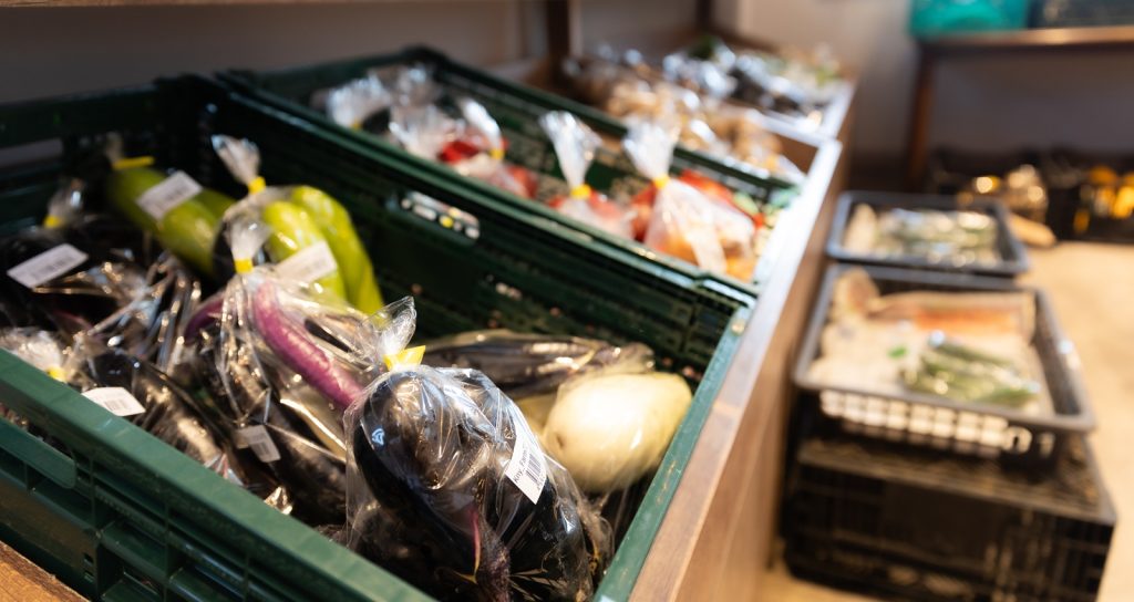 店内では毎朝届く地場産の新鮮な野菜も販売しています。中には花園たまやで作られる「スーパー堆肥」を使って育てた野菜も。