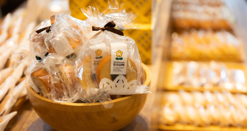マリアの卵を使った焼き菓子はお土産にも最適です。中でも人気の「花たまBAUM」(1個180円)は、マリアの卵とバターを贅沢に使ったほんのり甘いバウムクーヘン。しっとりとした舌触りがやみつきになります。